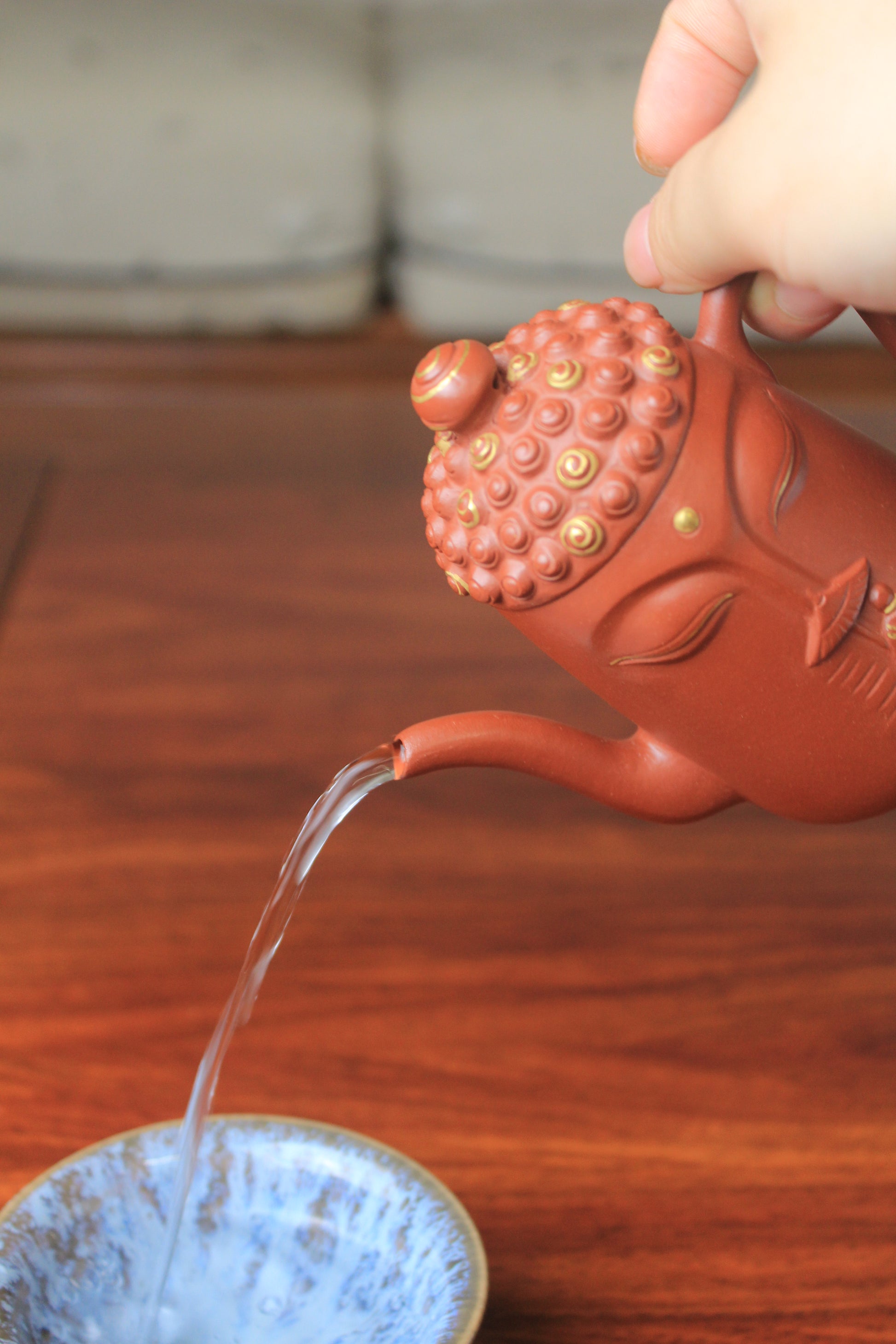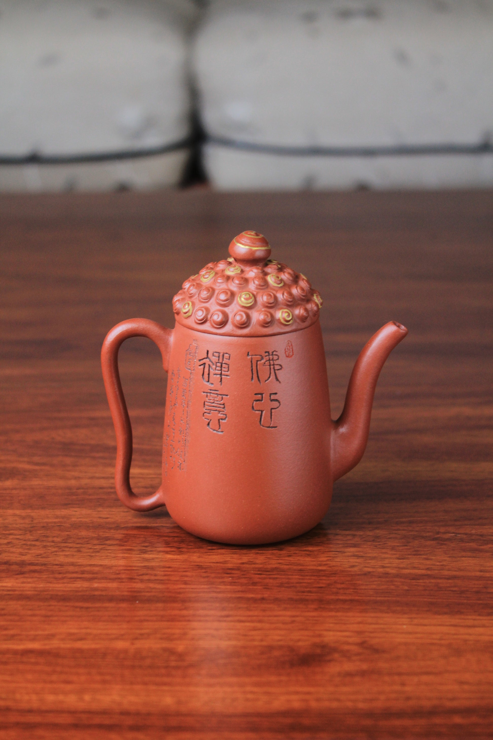 This exquisite Yixing teapot, named "Buddha," exemplifies traditional Chinese craftsmanship through its half-handmade construction using premium zhu ni clay. The 135ml capacity provides the ideal volume for brewing fine teas, allowing their complex flavors to develop fully. The distinctive red-orange zhu ni material is prized for its excellent porosity, heat retention, and ability to enhance tea's aroma and taste with continued use.